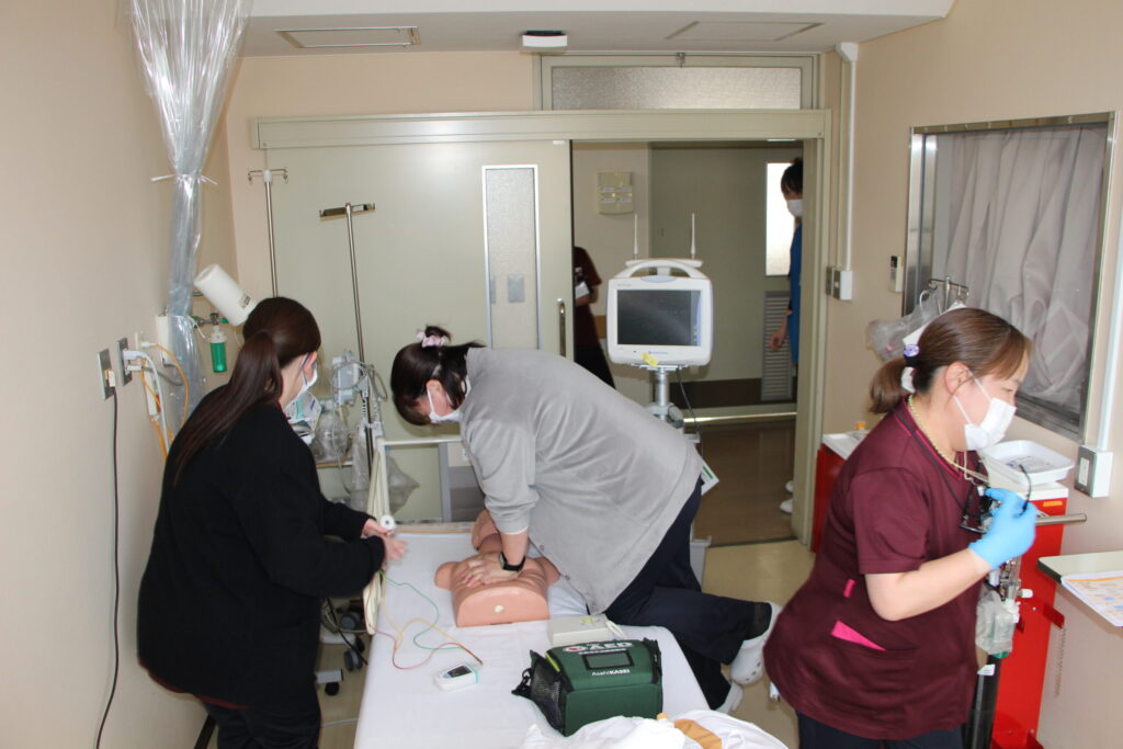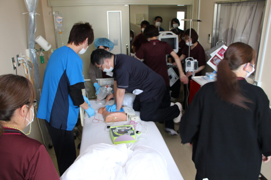 この訓練は患者様の急変時に迅速に対応できるように医療従事者を対象とし年に数回実施しています。