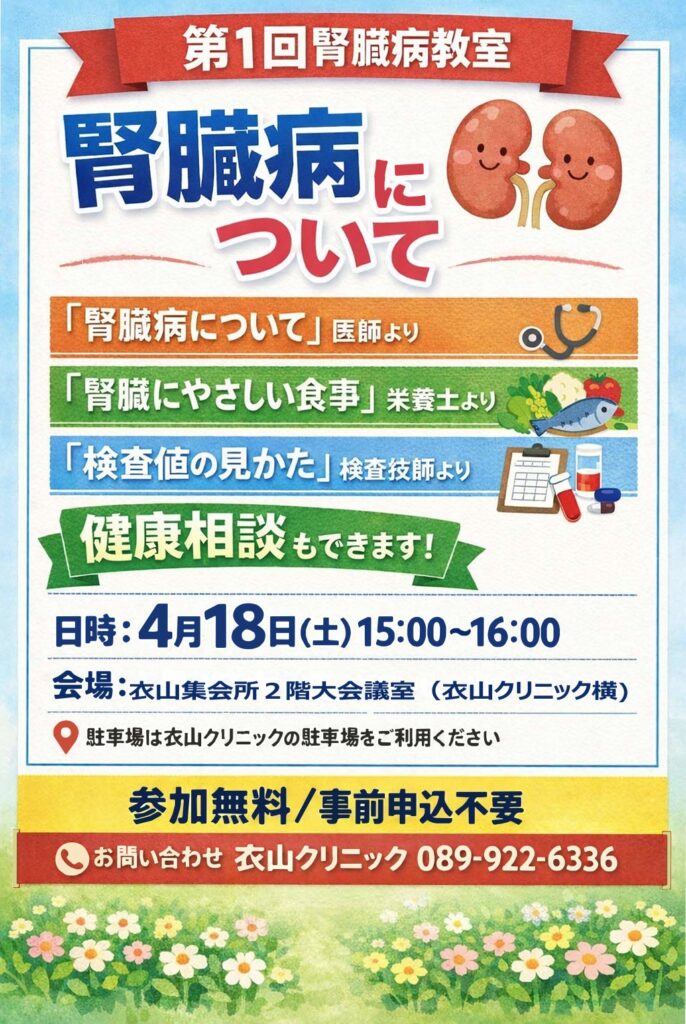 当院の患者様におかれましては、本年も健康で心穏やかな1年をすごせるようスタッフ一同精進してまいります。来年度は患者様及び周辺住民の方向けの勉強会を開始いたします。第1回は令和8年4月18日(土)15時から衣山集会所2階大会議室で行う予定ですのでご興味がある方はぜひご参加ください。その他何かご要望がございましたらいつでもお申し付けいただきますよう宜しくお願い申し上げます。